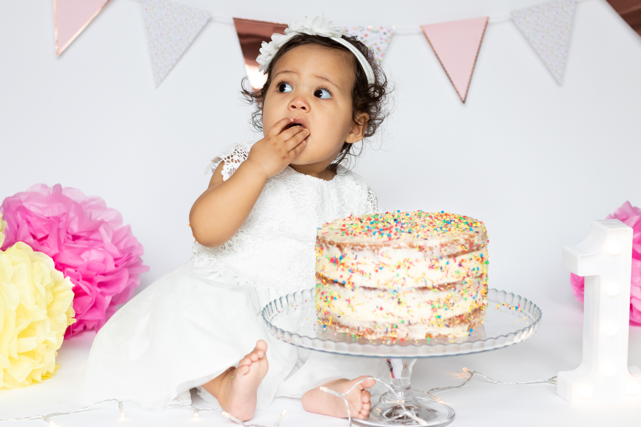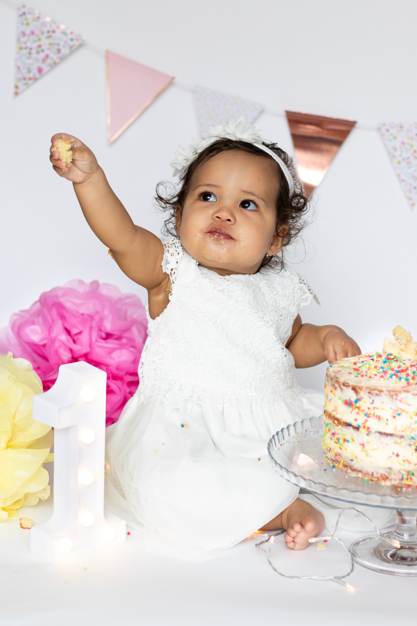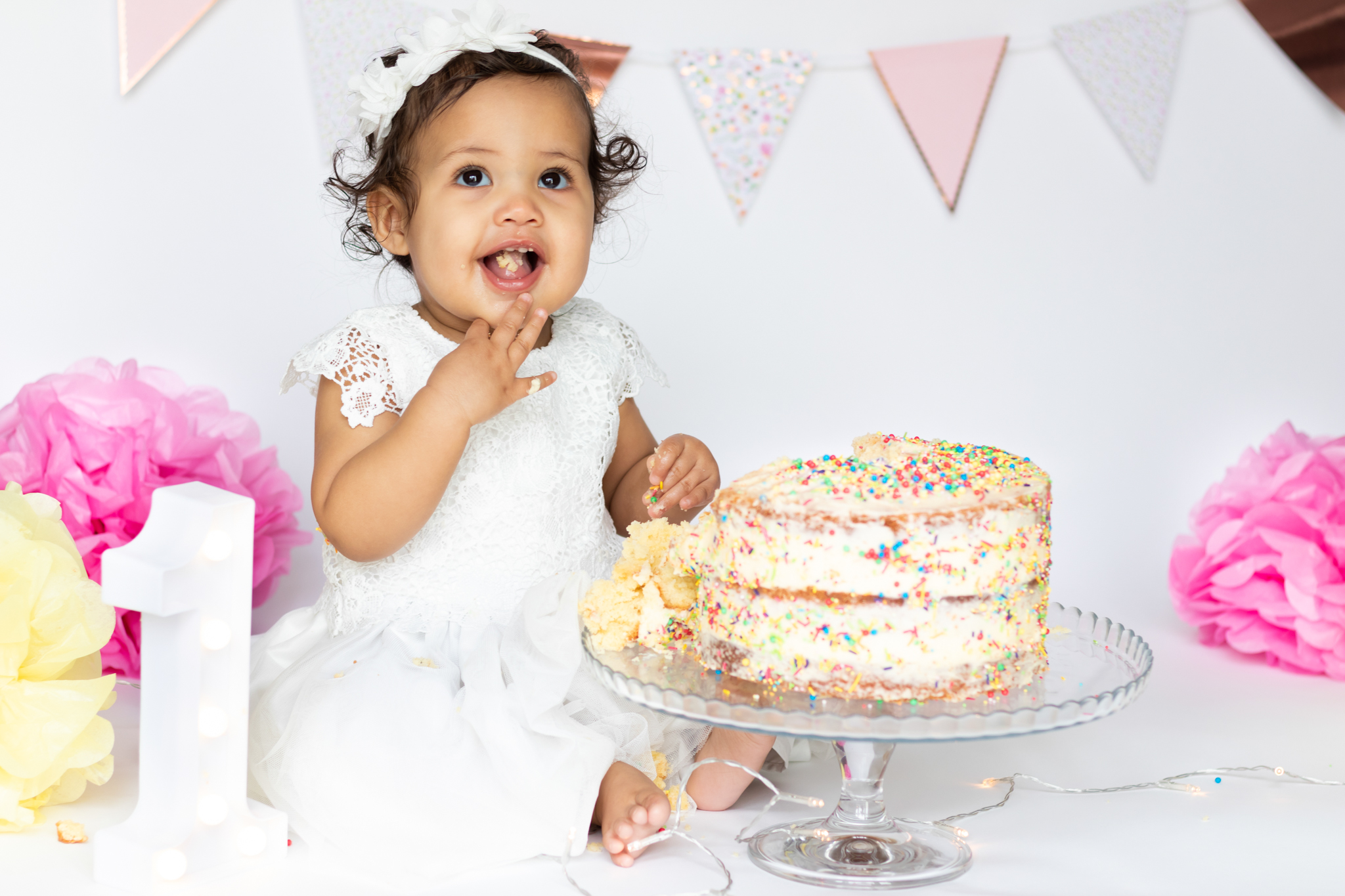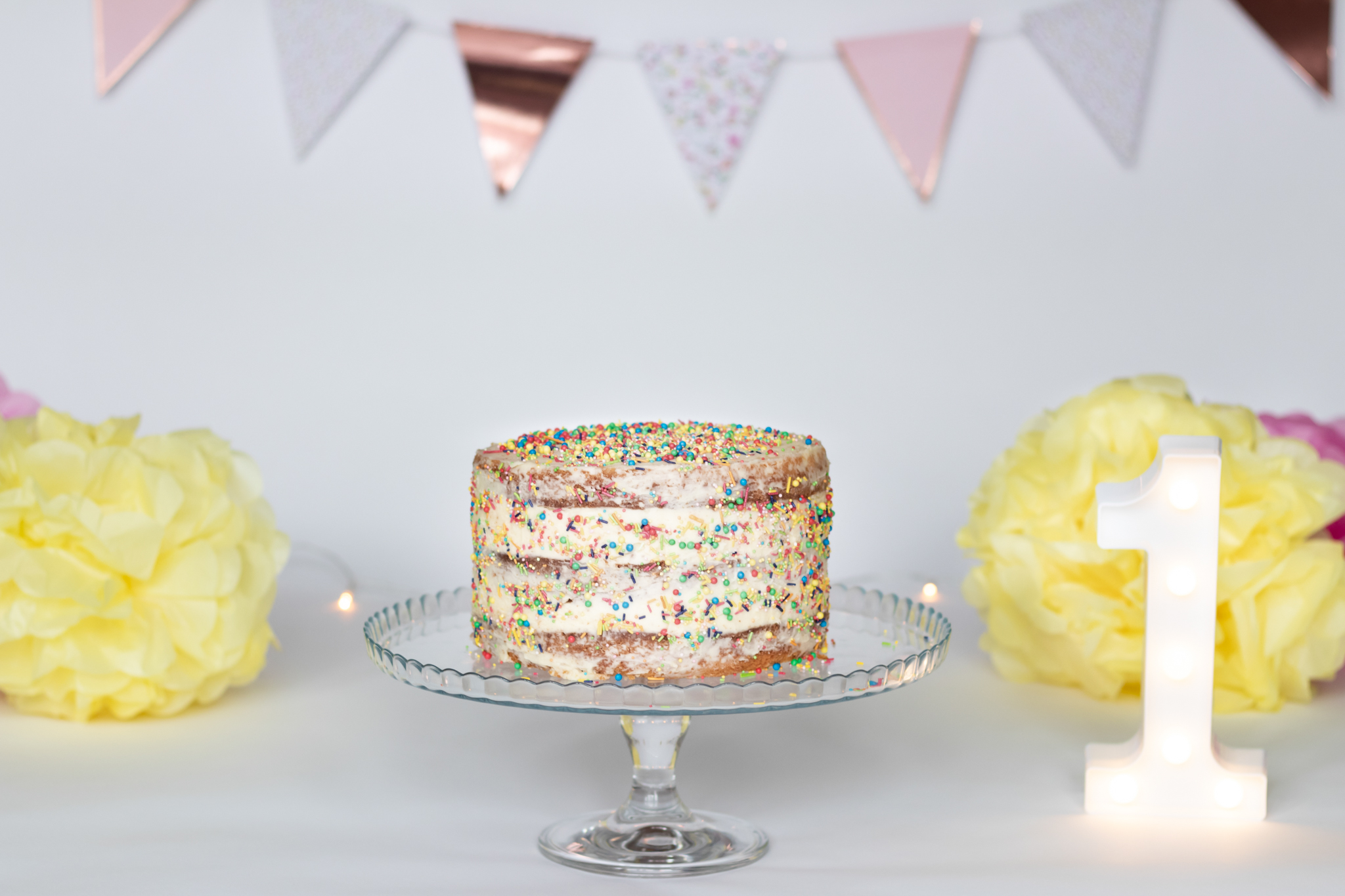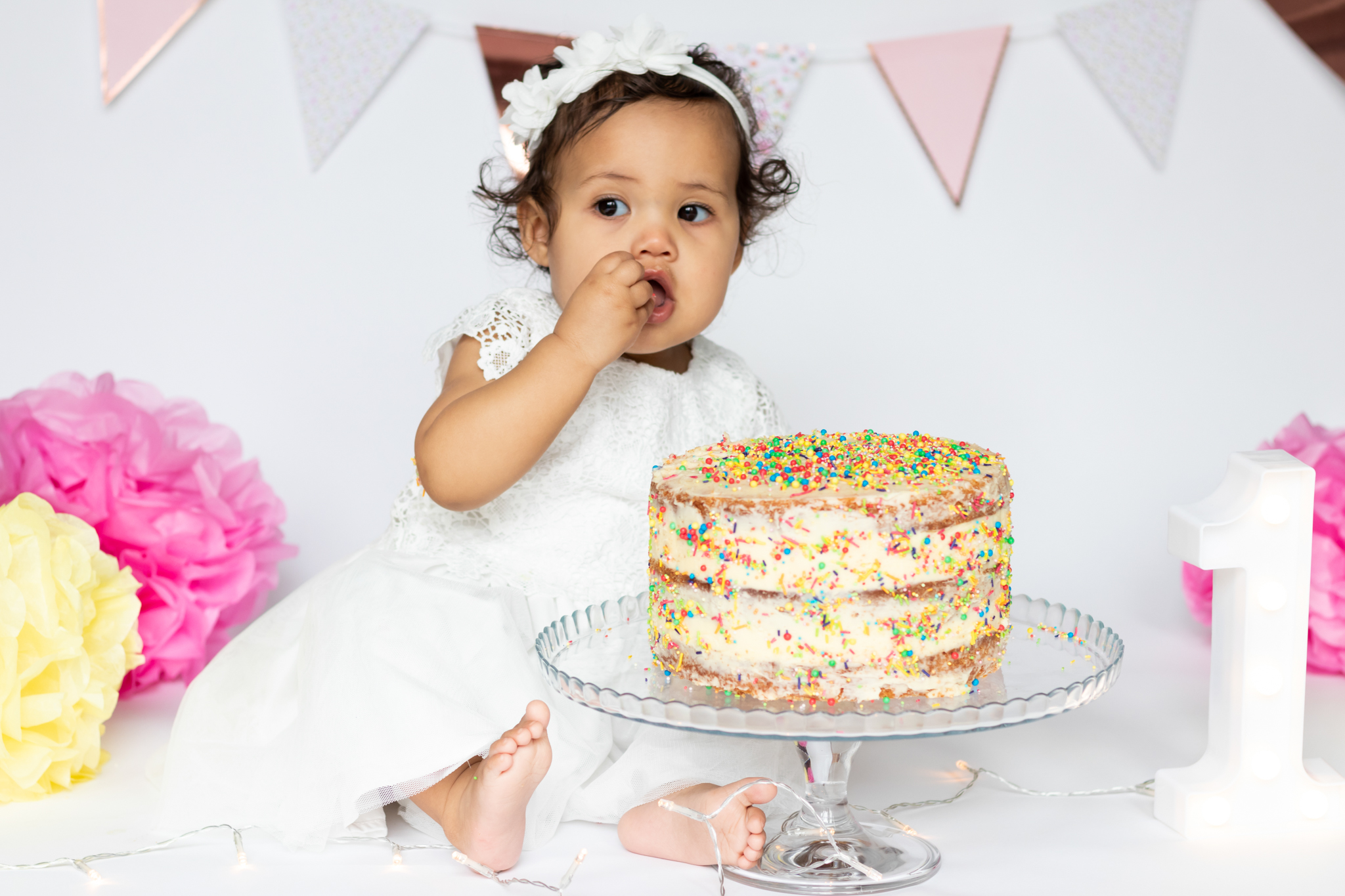 Nyla’s 1st birthday cake smash included fairy lights, bunting, pom poms and an epic homemade cake to celebrate.